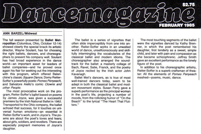 “Ballet Met presented last night at the Ohio Theater Domy Reiter-Soffer's “Pomes Penyeach” inspired by the pomes of the same name by James Joyce. Reiter-Soffer took 19 poems, choreographed brief and strong movement accompanied the dance with poems read by the famous Irish actor John Kavanagh and Music by Joyce's contemporary composers Ravel, Satie, Debussy and Franck. The result is powerful, sometimes humorous, often tragic dance that paralleled Joyce's sad Life.