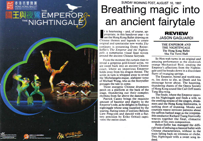 “Cheers and applause greeted the Hong Kong Ballet in last night performance of the Emperor and the Nightingale based on Hans Christian Anderson's Fairy tale Story. This was really a first class happening and a wonderful Poetry of dance choreographed by Domy Reiter-Soffer. This three-act ballet creates a colourful spectacle, which immediately captivates the audience by its theatricality, and interesting choreography. The style is a fusion of classical, modern and oriental movement, and the ballet on the whole is a demonstration of perfection that immediately creates an impact on the audience. The Music by Richard Tsang is orchestral with three huge Drummers bare to the waist drumming throughout the ballet and create a wonderful exciting visual. The dancers Fei Leung as the maid Michael Wang as the minister and especially both Erico Ochiai as the real Nightingale and So Han-Wah as the Mechanical Bird made an impact to this moving and exotic tale ballet”.